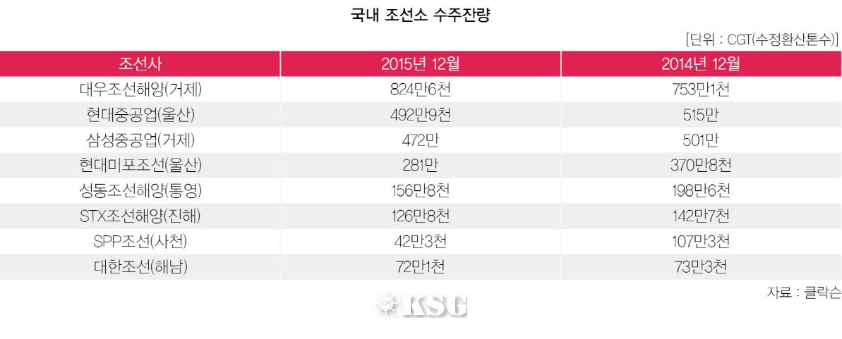 이밖에 2014년 28위(107만3천CGT)에 자리했던 SPP조선은 2015년 65위(42만3천CGT)로 순위가 크게 떨어졌다. 일감이 1년 전에 비해 소폭 감소한 대한조선은 44위(72만1천CGT)에 자리했다.