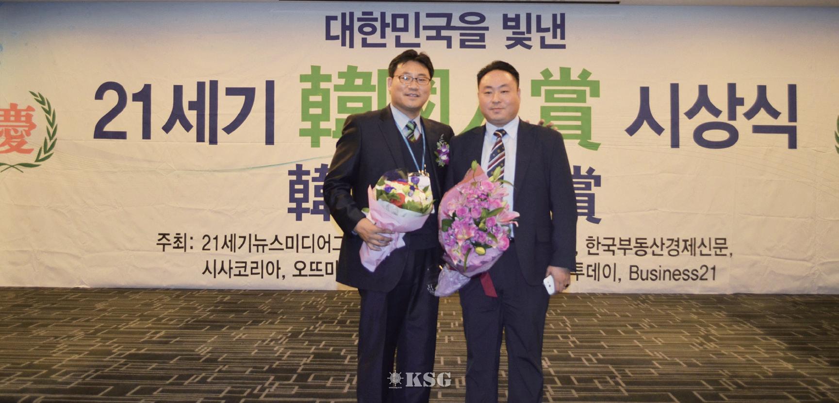 | ▲ 지난 2014년 10월 JMTC는 국제물류 산업발전에 기여한 공로를 인정받아 ‘대한민국을 빛낸 한국인물 대상’을 수상했다. 사진 왼쪽부터 김현성 대표이사, 김호성 이사 |