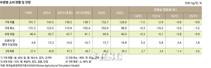 한국농촌경제연구원에 따르면 7대 곡물(쌀, 보리, 밀, 콩, 옥수수, 감자, 고구마) 수입액은 2014년 1만7358억 달러에서 2025년 1만8240억 달러로 증가할 것으로 보인다. 2016년 쌀을 포함한 곡물류 재배면적은 전년보다 1.4% 감소한 96.1만 ha로 예상된다. 시장개방 확대에 따른 수입증가와 교역수지 악화에 따른 소득증가로 인해 자급률은 하락하고 있으며, 중장기적으로 체결된 FTA영향이 누적되면서 농산물 자급률은 지속적으로 하락할 전망이다.