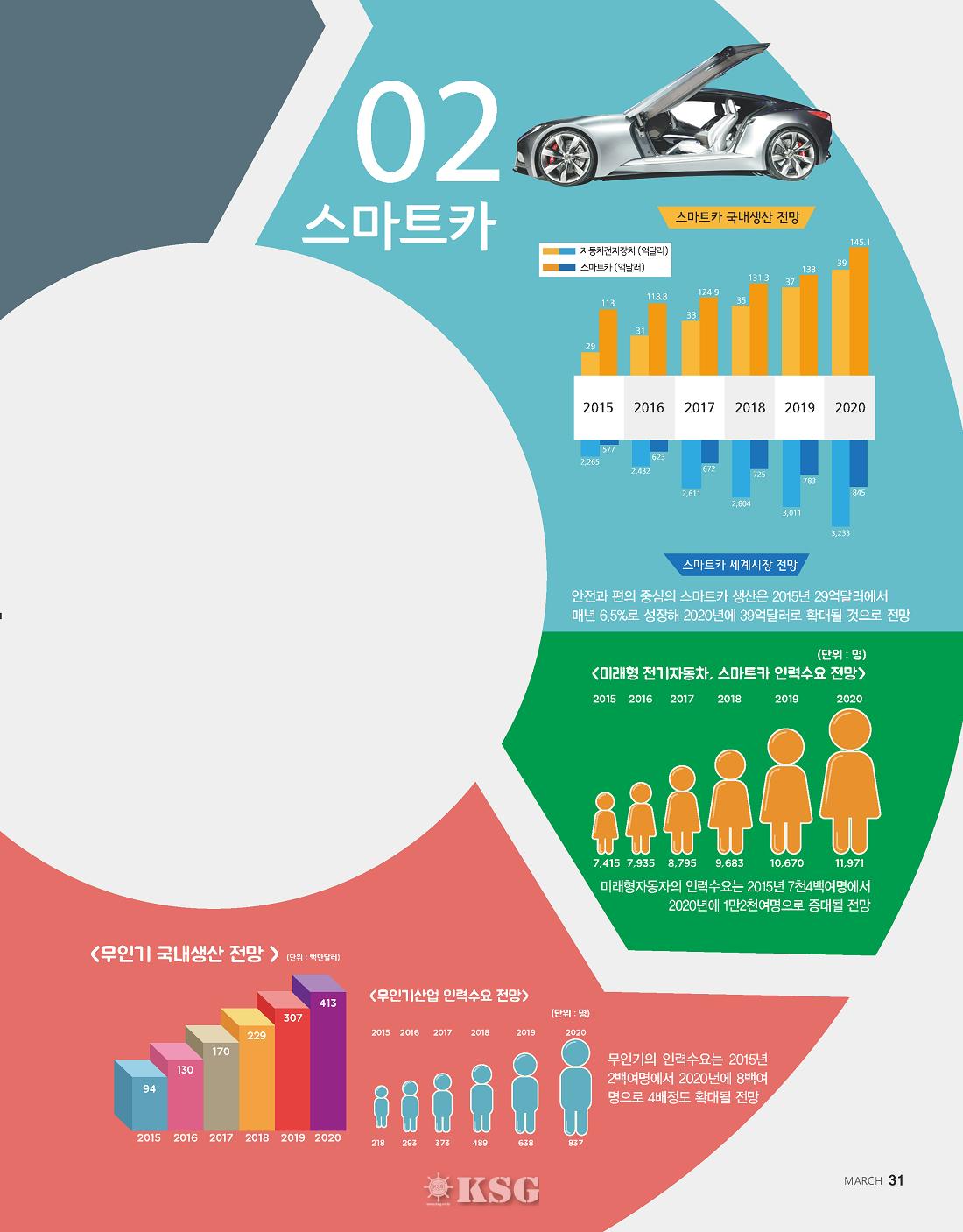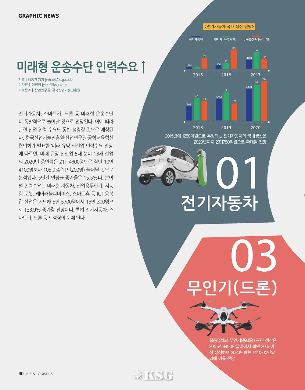 전기자동차, 스마트카, 드론 등 미래형 운송수단이 폭발적으로 늘어날 것으로 전망된다. 이에 따라 관련 산업 인력 수요도 동반 성장할 것으로 예상된다. 한국산업기술진흥원·산업연구원·공학교육혁신협의회가 발표한 ‘미래 유망 신산업 인력수요 전망’에 따르면, 미래 유망 신산업 5대 분야 13개 산업의 2020년 총인력은 21만4300명으로 작년 10만4100명보다 105.9%(11만200명) 늘어날 것으로 분석됐다. 5년간 연평균 증가율은 15.5%다. 분야별 인력수요는 미래형 자동차, 산업용무인기, 지능형 로봇, 웨어러블디바이스, 스마트홈 등 ICT 융복합 산업은 지난해 5만 5700명에서 13만 300명으로 133.9% 증가할 전망이다. 특히 전기자동차, 스마트카, 드론 등의 성장이 눈에 띈다.