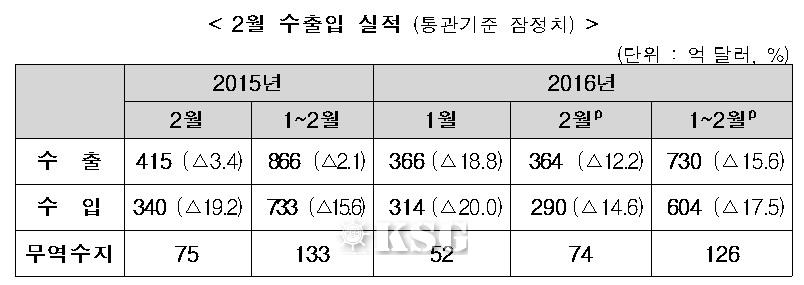 2월 수출은 전년 동월 대비 12.2% 감소한 364억달러를, 수입 역시 14.6% 급감한 290억달러로 집계됐다. 무역수지는 74억달러를 기록, 49개월 연속 흑자를 달성했다.