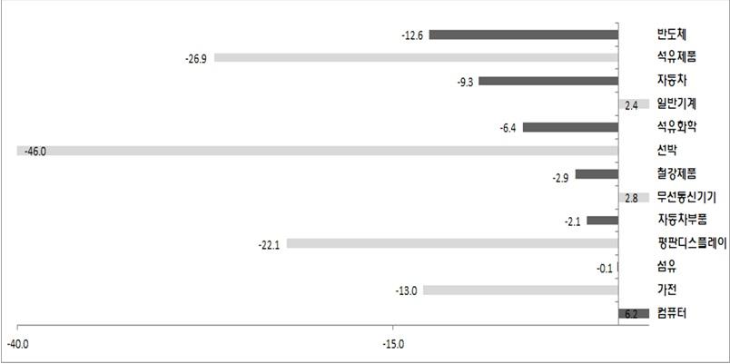 수입은 원자재(-25.5%)와 자본재(-9.3%), 소비재(-5.5%) 등이 감소세를 보이며 전망을 어둡게 했다. 석탄과 가스는 -41%, 반도체용 제조장비는 -54.1%의 감소세를 지속했다.
