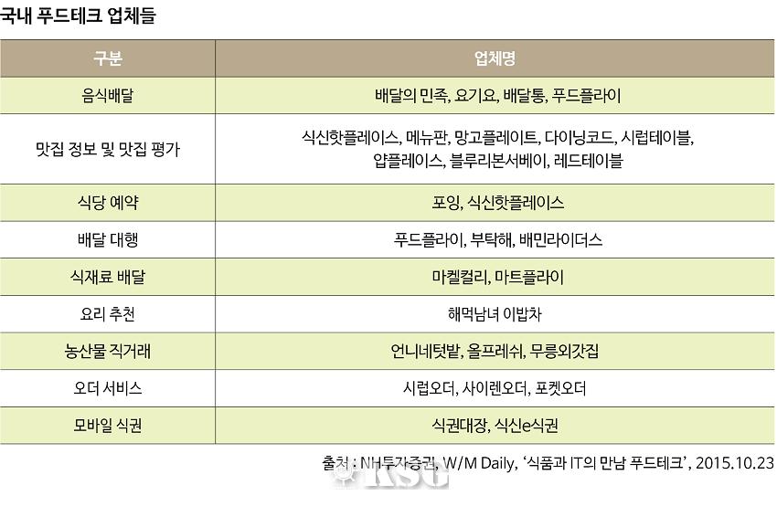 참고자료 : LG경제연구원 <글로벌 푸드 서비스 스타트업들 수조원대 기업으로 부상>, 한국인터넷 진흥원 <푸드테크와 성장하는 푸드 O2O 서비스>, 도서 <모바일트렌드 2016>