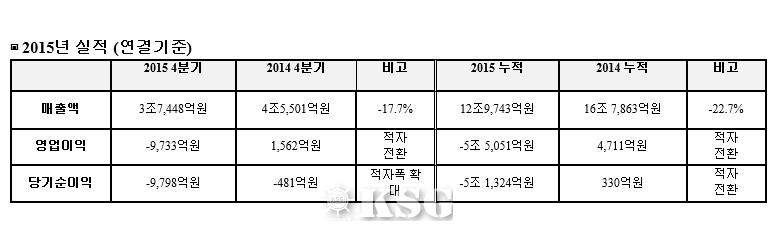 지난해 4분기 영업손실도 9733억원으로 적자 규모가 1조원에 달했다. 2014년 4분기에는 1562억원의 영업이익을 기록했지만, 2015년 4분기에는 적자로 돌아섰다. 매출도 3조7448억원으로 전년 동월 4조5501억원 대비 17.7% 감소했다. 순이익은 -9798억원으로 적자 폭이 확대됐다.