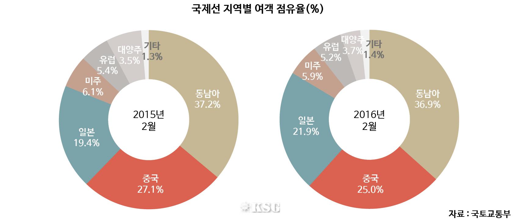 국제선 여객은 저비용항공사(LCC) 중심의 신규노선 및 운항 확대, 저유가에 따른 국제선 유류할증료 면제로 인한 항공여행 비용절감 효과, 일본, 유럽 등 내국인 해외여행 수요증가 등으로 지속적인 성장세를 기록중이다. 2월 국제선 여객수송량은 전년 동월대비 15.7% 상승한 585만명을 기록했다.