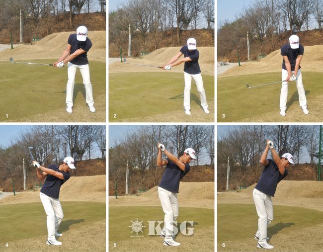 보통 레슨은 초보용, 중급용, 상급용 선수용으로 나눌 수 있다. 이렇게 세분화해 가르쳐야만 골퍼들이 받아들일 수 있다. 실력은 중급 이상인 분들이 초보용 레슨으로만 치는 분들이 많다. 실력이 늘수록 그에 맞는 레슨을 새로 배워야 한다. 한 번씩 체크해 보기 바란다. 초보에게 “힘 빼고 쳐라!” “헤드업 하지 마라!” “채를 던져라!” 라고 해봤자 잘 되지 않는다. 초보에 맞는 올바른 연습을 통해 그 과정을 겪어야만 된다. 예를 들어 사진1번으로 테이크백과 백스윙을 배우다 시간이 흘러 강사가 바뀌어 레슨을 받으니 사진2로 가르친다. 전 강사가 잘못 가르친 것이 아니다. 사진3으로 하고 있다면 사진2로 해야 사진1처럼 되기 때문이다. 또 사진4처럼 하고 계신분이 있다. 강사는 사진6처럼 하라고 한다. 이유는 그렇게 해야 사진5과 같은 올바른 스윙이 되기 때문이다. 위와 같은 레슨은 받는 분들이 많이 헛갈려 하신다. 혼자 고칠 때 주의할 점은 사진6처럼 하면 안 된다는 것이다.