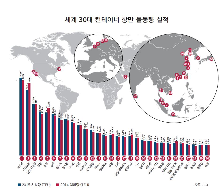 영국 해운전문 저널 컨테이너리제이션 인터내셔널(CI)이 집계한 2015년 세계 30대 컨테이너 항만 순위에서 중국발 수출침체는 전 세계 항만에 광범위하게 영향을 미쳤다.
