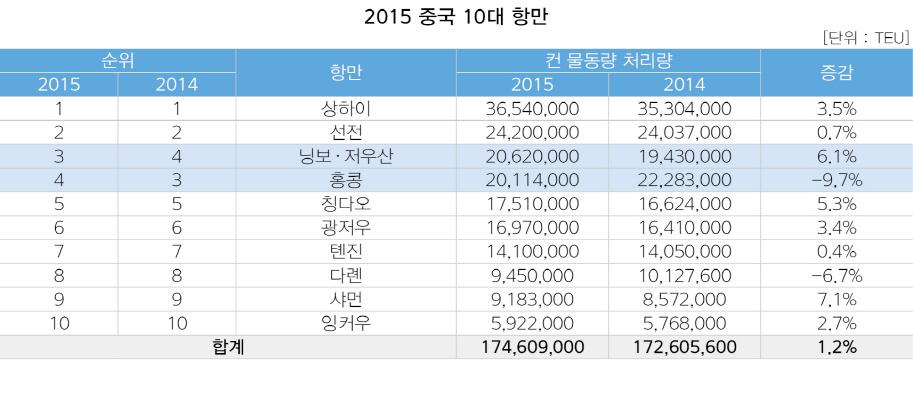 전세계 상위 10위 항만의 평균 물동량 성장률은 2014년 2억1590만TEU에서 지난해 2억1600만TEU로 0.4%의 근소한 성장을 보였다. 중국 상하이항은 지난해 3650만TEU를 처리하며 6년 연속 컨테이너 처리 1위 항만에 선정됐다. 상하이항은 전년대비 3.5%의 물동량 성장을 기록했다. 닝보·저우산항은 홍콩항을 제치고 4위로 한 계단 올라섰다. 닝보는 지난해 2060만TEU를 처리하며 전년대비 6.1% 성장, 상위 10위 항만 중 가장 큰 성장을 보였다.