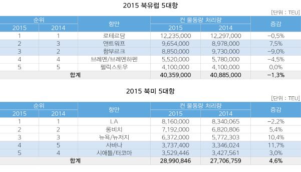 미 서안 항만들은 2014년 말부터 시작된 항만노동자 협약이 늦춰지면서 파업으로 곤혹을 치렀지만 작년 2월 모두 해결됐다. 롱비치항은 전년대비 5.4% 증가한 720만TEU를 처리했다. 작년 초 항만 혼잡 문제가 있음에도 불구하고 저유가로 인한 가처분 소득이 증가하면서 미국 소비시장은 강력해졌다. 인근항인 LA항은 2014년 대비 2.2% 감소한 810만TEU를 처리했지만 북미지역 관문으로서 위치는 유지했다.