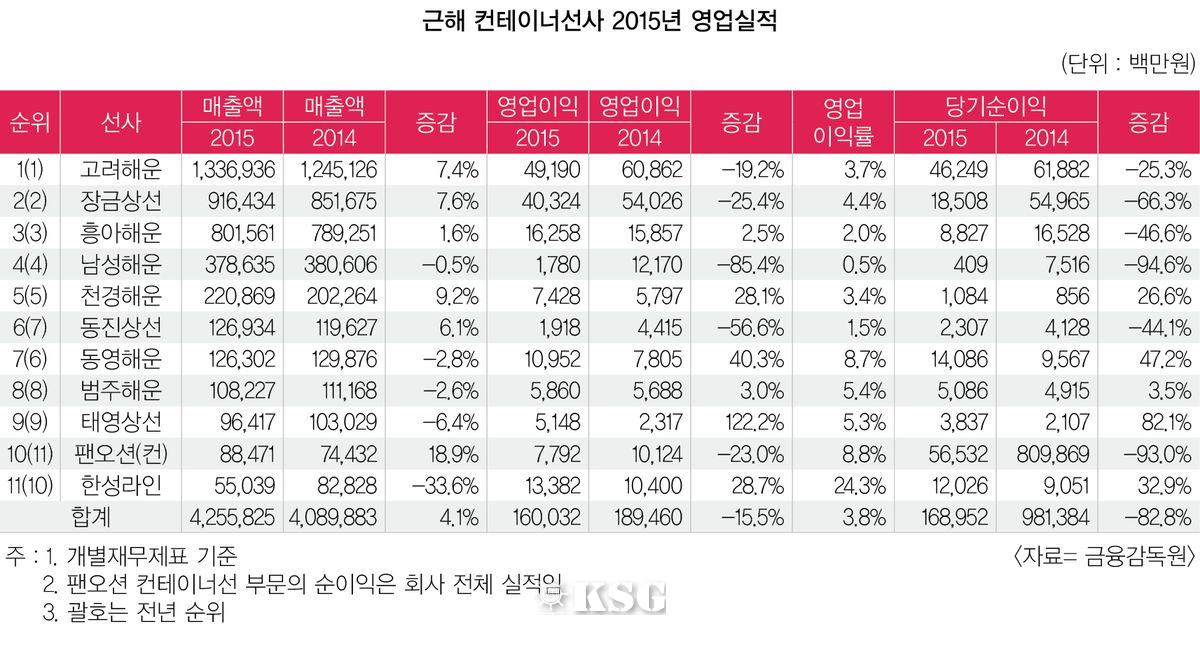 법정관리 졸업 후 시장 확대에 나서고 있는 팬오션 컨테이너선 부문은 지난해 매출액 885억원 영업이익 78억원을 거뒀다. 지난해 남중국항로에 진출하며 동남아항로 진출이 다리를 놓은 이 선사는 외형이 18.9%나 성장하는 괄목할 만한 실적을 보여줬다. 다만 영업이익은 2014년 101억원에서 23% 감소했다.