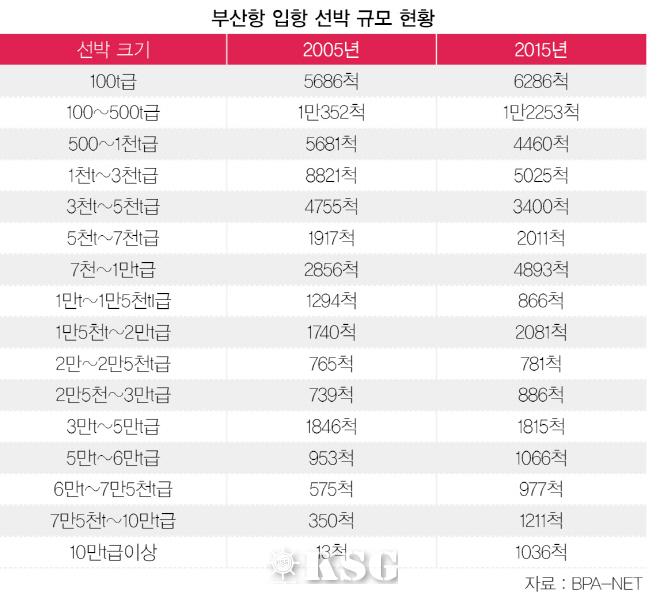 부산항만공사(BPA)에 따르면 2005년 단 13척의 10만t급 선박이 부산항을 찾았으나, 2010년엔 114척으로 크게 늘었으며 지난해에는 처음으로 1000척을 넘어섰다. 몇 십년 전만해도 3만~4만t급 선박이 주류를 이뤘지만 선사들은 선박 몸집을 두배 이상 키워 규모의 경제를 실현하고 있다. 2만t급 선박 5척을 해상에 투입하는 것보다 10만t급 선박 1척을 운용하는게 기름값과 인건비 등의 비용절감을 실현할 수 있다는 이유에서다.