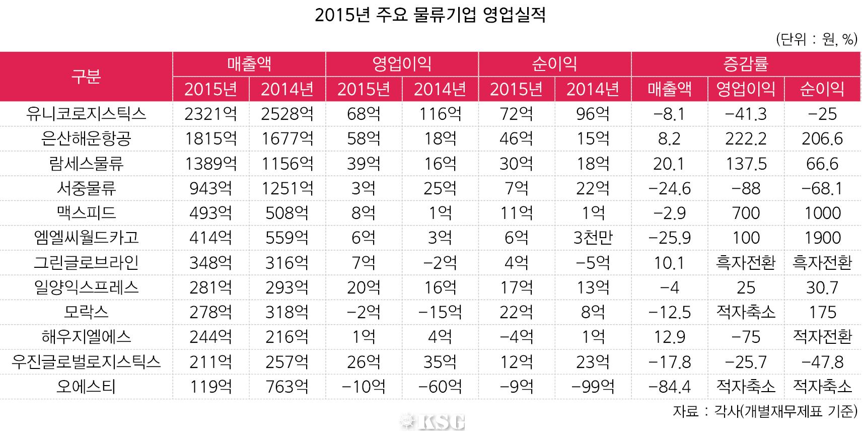 유니코로지스틱스는 러시아와 중앙아시아 경기불황의 직격탄을 그대로 맞았다. 유니코로지스틱스의 지난해 영업이익은 68억원으로 1년 전 116억원에 비해 41.3% 급감했다. 매출액 역시 8.1% 감소한 2321억원을 기록했다. 매출액 하락은 화물운송에서 기인했다. 주 수입원인 화물운송 수익은 2014년 2323억원에서 2015년 1926억원으로 감소했다. 반면 임대선박 매출은 204억원에서 395억원으로 상승했다.
