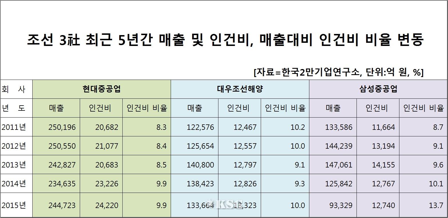 조선업계 '빅3'인 현대중공업과 삼성중공업, 대우조선해양의 매출액 대비 인건비 비중이 평균 11.2%에 달하는 것으로 나타났다. 이는 해운 '빅2'인 한진해운과 현대상선의 평균 2%보다 5.6배나 높은 것이다. 인건비 비중이 가장 컸던 기업으로는 삼성중공업이 꼽혔다.