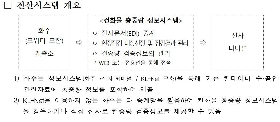 현재 해수부는 제도 개요, 계측소 운영현황 등 관련 정보를 담은 누리집(http://www.vgm.kr)을 구축하고 제도 운영기관인 케이엘넷의 중계시스템을 개선하는 등 시범 운영 준비를 마친 상태다. 시범 운영 기간 동안 선사가 지정하는 화주가 총중량 검증정보를 제공하면, 검증정보의 정상적 유통 여부 및 신고 된 총중량의 신뢰도 등을 확인할 수 있다.