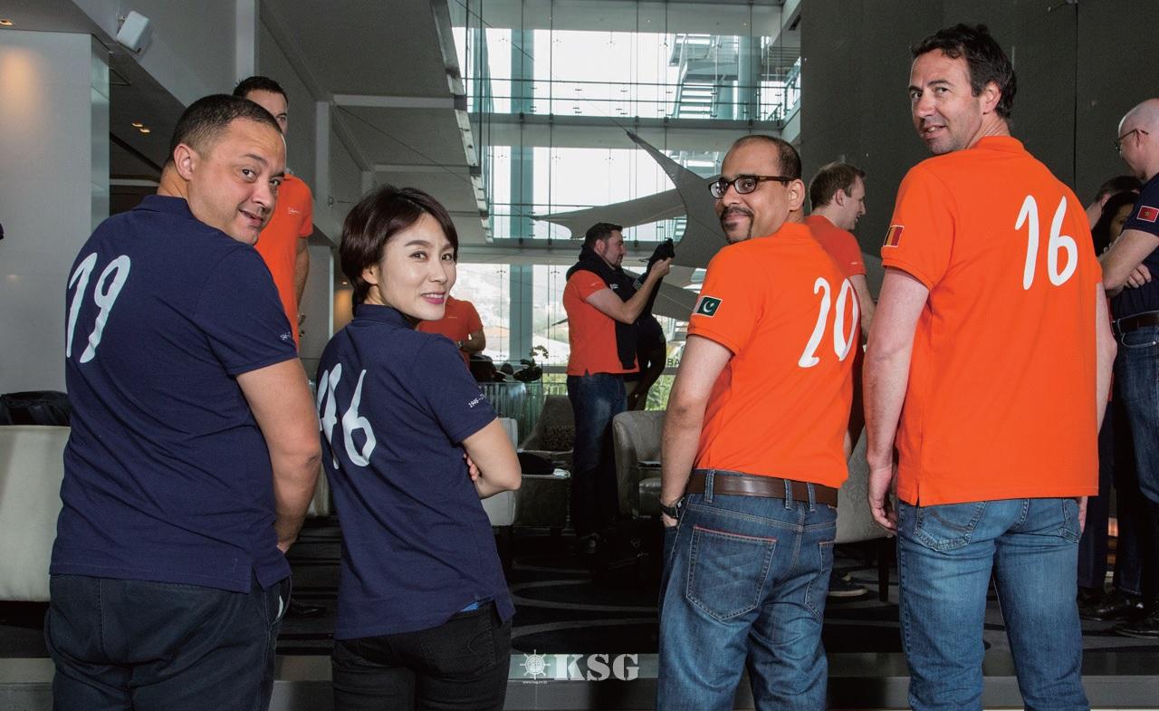 | ▲ 사프마린 리더들이 창립연도부터 현재까지를 나타내는 숫자티를 입고 기념사진을 찍고있다. 사진 왼쪽 두번째가 안소연 지사장이다. |