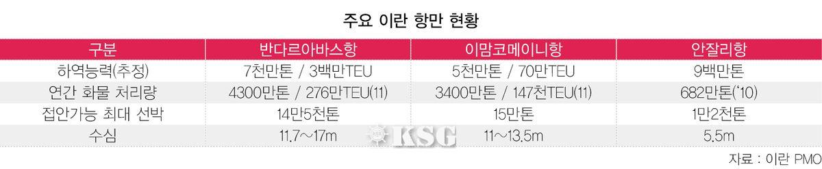 하지만 전반적인 항만시설 및 운영시스템은 우리나라의 1980∼90년대 수준에 머물러 있어 항만개발 수요가 늘어날 것으로 기대된다. 현재 1만2천TEU급 컨테이너선이 기항할 수 있는 반다르아바스항은 항만개발이 진행 중이다. 1단계 부두개발은 마무리됐으며 현재 2단계는 토목공사를 마치고 하역장비를 구매중으로 3단계 개발 종료시 연간 800만TEU를 처리할 것으로 예상된다.