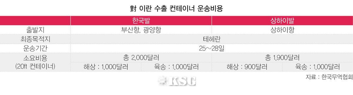 무역협회에 따르면 이란 수출시 바이어가 밀집돼 있는 테헤란까지 소용되는 물류비는 내륙운송을 포함해 총 2천달러 수준이다. 한국의 수출화주는 항만까지만 운송하고 내륙운송은 이란의 수입자가 처리한다. 이란 내륙운송은 당국에서 허가받은 업체만 이용 가능하므로 운송거리 대비 운임이 비싼 편이며 할인 가능성이 거의 없다. 때문에 한국에서 이란 항구까지의 해상운송비와 이란 항구에서 테헤란까지의 내륙운송비가 비슷한 수준이다.