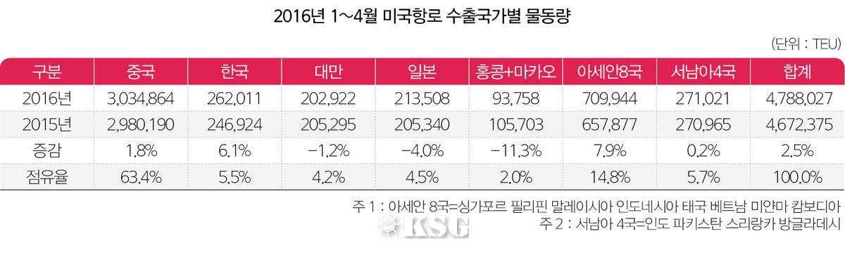 특히 4월 한 달간 일본발 북미 수출화물은 전년동월대비 -15.1%, 한국발은 -13.7%의 마이너스 성장률을 기록하며 크게 하락했다. 대만도 전년동기대비 14% 감소했으며 서남아시아에서는 인도와 파키스탄이 각각 14%, 18.9% 감소했다. 가장 큰 수출증가를 보이던 중국은 0.3%의 미약한 증가에 그치며 전년과 비슷한 수준에 머물렀다.