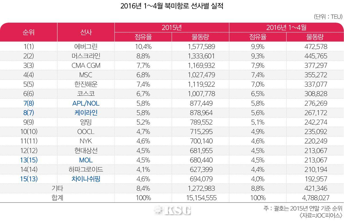 한진해운은 1~4월 북미항로에서 33만7077TEU를 실어 날랐다. 한진해운의 시장점유율은 0.4%포인트 하락한 7%의 점유율을 기록했지만 여전히 5위 자리를 지켰다. 작년 말 이후 15개의 선사 중 상위권의 순위는 거의 변화가 없었지만 중위권과 하위권에서 변동을 보였다.