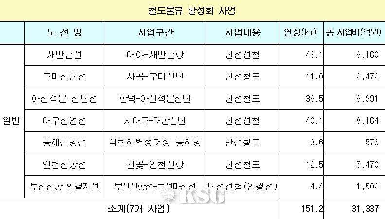 우선 국토부는 철송 수요가 많은 항만과 산업단지, 내륙화물기지를 간선 철도망과 연결하는 인입철도 건설을 추진한다. 부산신항 연결지선(부산신항선-부전마산선), 인천신항선(월곶-인천신항), 새만금선(대야-새만금항), 구미산단선(사곡-구미산단), 동해신항선(삼척해변정거장-동해항) 등 7개 노선이 철도물류 경쟁력 강화를 위해 추진된다. 총 151.2km에 달하는 연장에 3조1337억원의 사업비가 투입된다.
