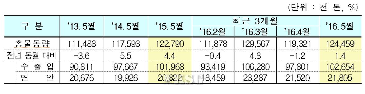 해양수산부는 지난 5월 전국 항만 물동량이 총 1억2446만t을 기록해 전년 동월 대비 1.4% 증가했다고 밝혔다.