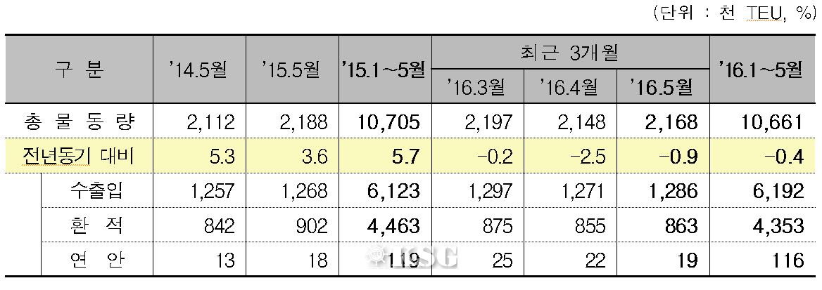 | ▲ 전국 항만의 최근 컨테이너의 물동량 처리 현황 |