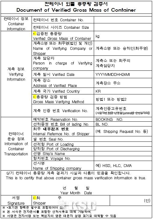 화주는 검증된 총중량 정보를 선박 접안 24시간 전에 선사에 제공해야 한다. 다만 중국, 일본, 러시아 등 근해항로를 취항하는 선박에 실리는 화물의 경우 접안 전까지 정보를 제출하면 된다.