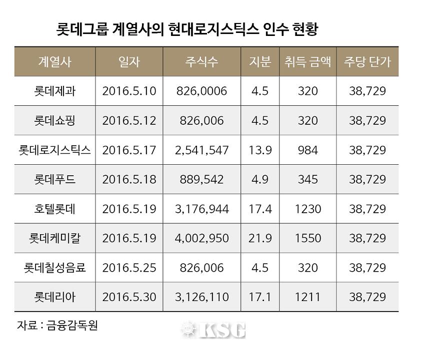 롯데그룹에 대한 검찰의 고강도 압박수사가 진행되면서 현대로지스틱스(이하 ‘현대로지스’) 인수에 제동이 걸렸다. 롯데는 콜옵션 행사를 통해 현재 특수목적법인(SPC) ‘이지스일호’가 보유한 현대로지스의 지분 88%를 하반기까지 모두 인수할 예정이었다. 이를 위해 지난 5월10일 롯데제과(4.5%)를 시작으로 롯데쇼핑(4.5%), 롯데로지스틱스(이하 ‘롯데로지스’)(13.9%), 롯데푸드(4.9%), 호텔롯데(17.4%), 롯데케미칼(21.9%), 롯데칠성음료(4.5%), 롯데리아(17.1%) 등 계열사 8곳을 통해 현대로지스의 지분을 순차적으로 진행하고 있다.