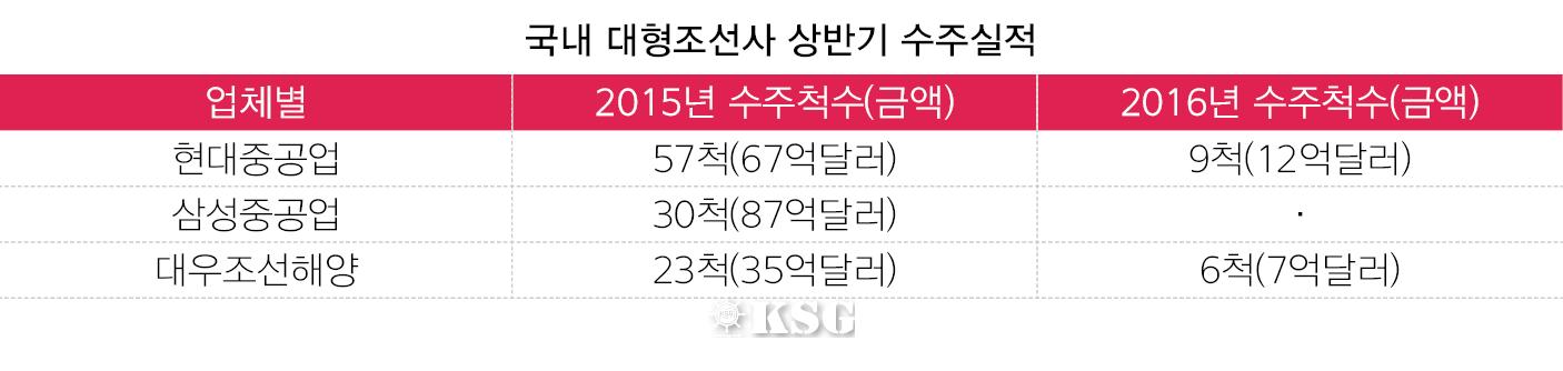 국내 대형조선 3사(현대중공업 삼성중공업 대우조선해양)의 올해 상반기 선박 수주량은 15척에 불과했다. 지난해 110척과 비교하면 크게 낮은 수치다. 지난해 조선사들은 유가하락이라는 반사이익으로 유조선과 컨테이너선을 중심으로 일감을 채울 수 있었다. 현대중공업은 57척을, 삼성중공업은 30척을, 대우조선해양은 23척을 각각 수주한 바 있다.