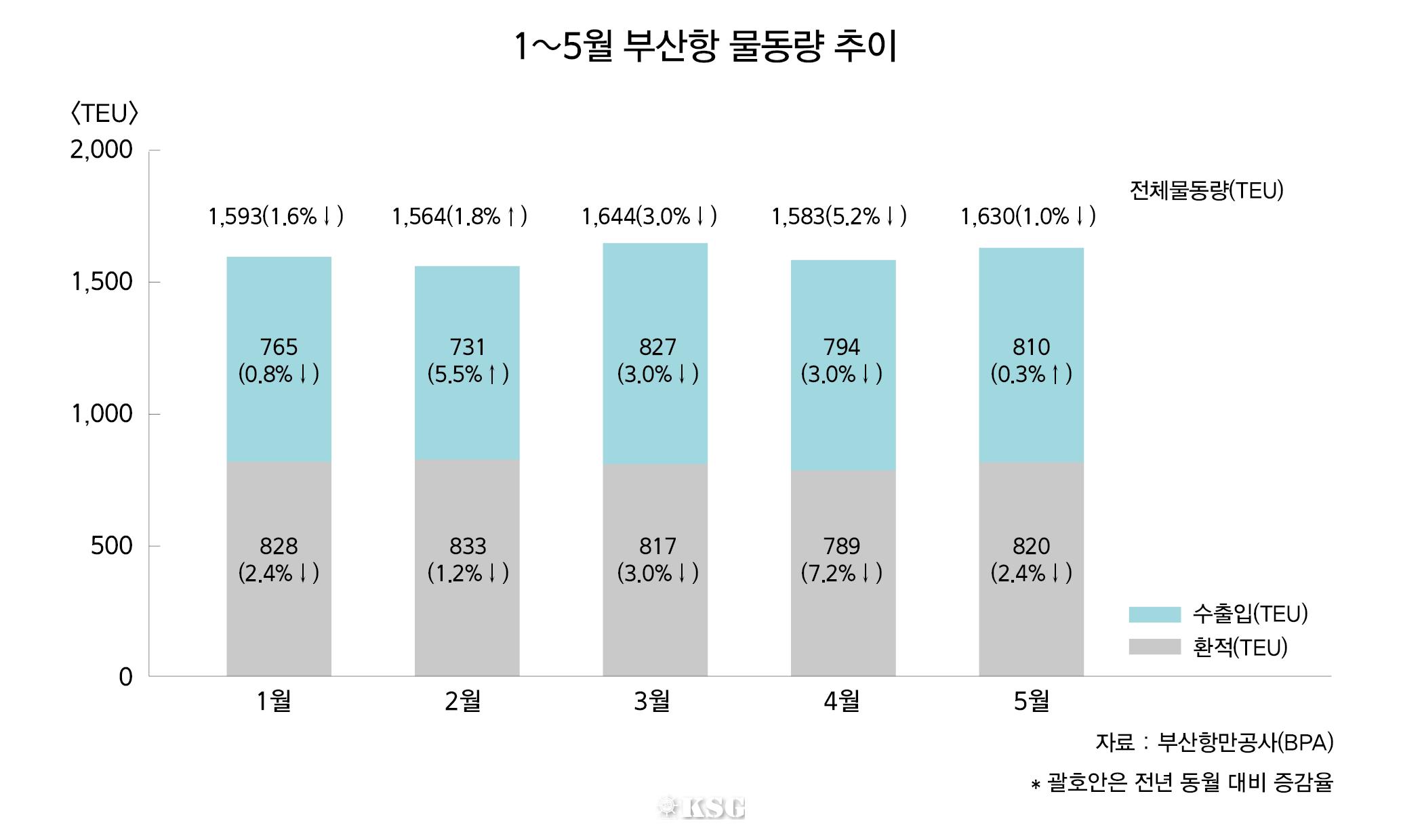 그나마 다행인 점은 지난 5월 수출입은 0.2% 증가한 81만TEU를 기록, 4월 79만4천TEU 대비 7천TEU 늘어 증가세로 전환됐다는 점이다. 환적은 전년 동월 대비 2.4% 감소한 82만1천TEU를 기록했다. 이는 전월 78만9천TEU 대비 4% 증가한 수치라는 점과 감소폭이 둔화(7.2%에서 2.4% 감소)됐다는 점에서 위안이 되고 있다.