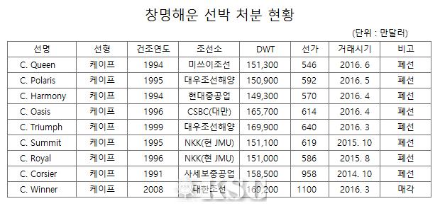 창명해운은 해운 불황이 장기화되자 선박 해체를 통한 자금 조달을 꾸준히 진행해왔다. 2014년 10월에 15만8000t급 <시코세어>(C. Corsier, 1991년 건조)가 LDT당 500달러, 총 958만달러에 해체됐으며 지난해 8월과 10월엔 15만1000t급 <시로열>(C. Royal, 1996년 건조) 시서밋(C. Summit, 1995년 건조)호가 각각 LDT당 326달러 334달러, 총 586만달러 619만달러에 폐선소에 매각됐다.