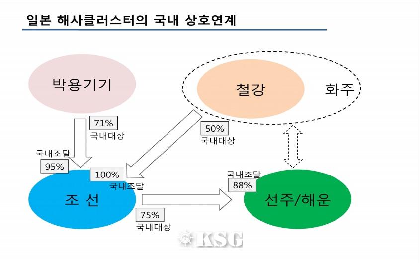 일본은 현재 선박 건조에 필요한 박용(舶用)기기 자급율이 95%에 달하며, 철강 역시 100% 자국 제품을 사용하고 있다. 해외지사와 공장에 쓰이는 제품 또한 자국에서 조달한다. 해운·조선과 관련된 모든 산업이 철저히 내수 중심으로 이뤄지고 있다. 반면 한국과 중국은 글로벌 조달형으로 각각 70% 40%를 나타냈다. 한 교수는 대형화주-종합상사-조선소-선사로 연결되는 '호혜의 써클'로 일본은 내수형 수요 조건을 갖췄다고 강조했다.
