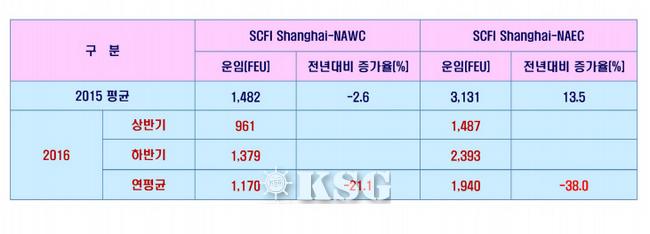 지난 15일 서울 여의도 해운빌딩에서 열린 ‘2016 상반기 해운시황 세미나’에서 한국해양수산개발원(KMI) 전형진 해운시장분석센터장은 올해 원양항로 평균운임은 북미항로에서 20~30%, 유럽항로에서 4% 가량 하락할 것이라고 내다봤다. 지난해에 이어 올핸 북미항로 운임이 곤두박질 친다는 예상이다.
