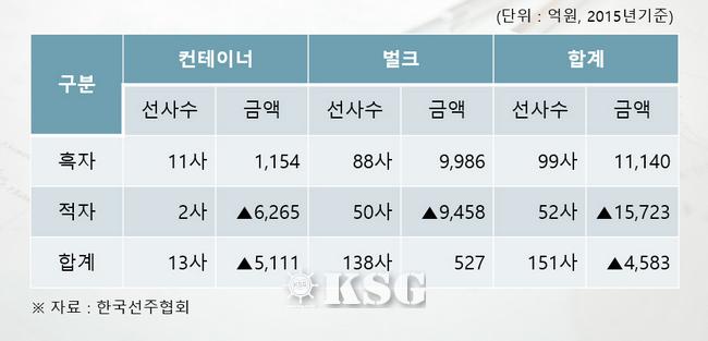 지난해 해운사 실적을 보면 팬오션 대한해운 폴라리스쉬핑 등 주요 중견벌크선사는 안정적인 수익을 달성하고 있다. 고려해운 장금상선 흥아해운 등 12개 아시아역내선사도 견실한 실적을 신고하고 있다. 선주협회에 가입한 외항해운사 151곳 중 99곳이 지난해 흑자를 거뒀다. 흑자 규모는 컨테이너 11곳 1154억원, 벌크 88곳 9986억원 등 총 1조1140억원으로 집계됐다.