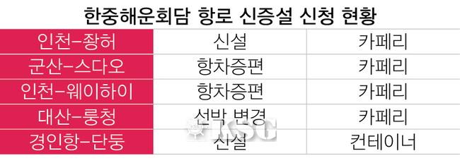 실적이 다소 상승세를 띠자 항로 안팎에선 다시 서비스 확대에 힘을 싣고 있다. 한중해운회담을 앞두고 3개 노선이 신증설을 추진 중이다. 인천-좡허(莊河)가 신설, 군산-스다오 인천-웨이하이가 항차 증편을 각각 꾀하는 노선들이다.