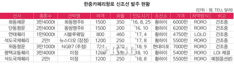 교동훼리도 신조선을 발주했다. 이 선사는 중국 황하이(黃海)조선과 3만4000t급 카페리선 신조 투자의향서(LOI)를 체결했다. 여객 1200명 화물 340TEU 규모다. 신조 가격은 5400만달러. 앞선 계약보다 600만달러 이상 싼 금액이다. 인도 시기는 2018년 10월께.