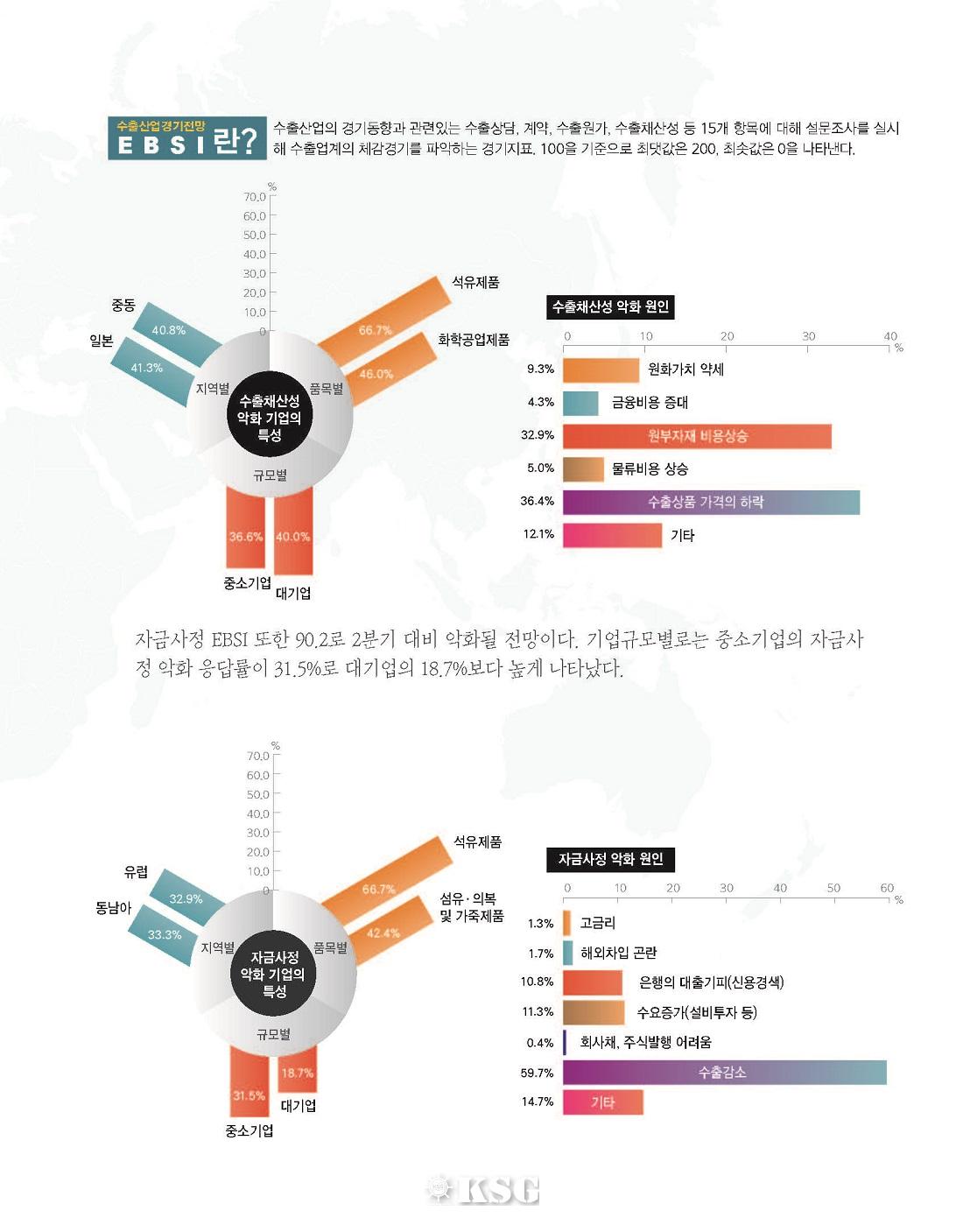 2016년 3분기 수출채산성 EBSI는 85.3으로 2분기에 비해 부진이 예상된다. 수출기업들은 수출채산성이 악화되는 주된 원인으로 수출상품 가격의 하락(36.4%)과 원부자재 비용상승(32.9%)을 지적했다.