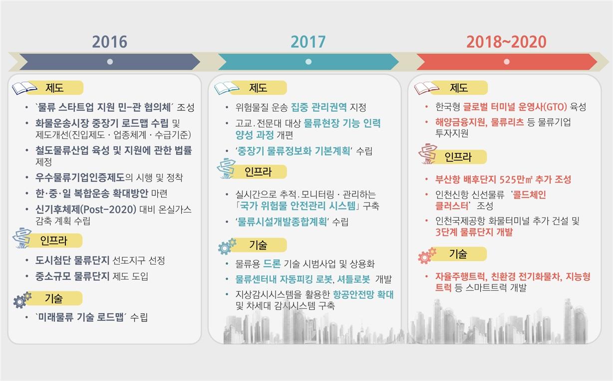 물류 신산업과 융복합 물류기업 지원을 위해 공항과 항만에 신선물류(콜드체인)와 전자상거래 맞춤형 물류기반 시설(인프라)이 공급되고, 물류로봇, 지능형 고성능 항만운영체계 등 친환경, 고효율 첨단 스마트 물류기술 개발을 본격화하겠다는 계획이다.