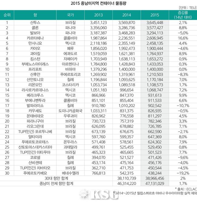 중남미 항만 성장률은 2012년 5.9%를 보인 이래, 2013년 0.7% 2014년 0.8%로 크게 위축했다가 지난해 소폭 회복세를 보였지만 여전히 고전을 면치 못하고 있다. 브라질, 페루, 푸에르토리코, 트리니다드토바고, 베네수엘라의 실적 악화 때문이다. 중남미 80개 항만 중 18개 항만을 차지하는 브라질은 물동량에서 꾸준히 1위 자리를 유지하고 있지만, 성장세는 한풀 꺾인 모습이다.