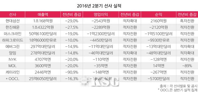 우리나라 양대 국적선사인 현대상선과 한진해운도 적자를 면하지 못했다. 현대상선은 1분기에 이어 2분기에도 영업이익 적자를 기록했다. 현대상선은 2분기에 매출액 1조168억원, 영업손실 2543억원, 당기순이익 2160억원(연결 기준)을 거뒀다. 매출액은 지난해 동기 1조4419억원에서 29% 감소했고 영업이익은 -683억원에서 적자폭이 확대됐다. 당기순이익은 2160억원으로 전년동기 1616억원의 당기순손실에서 흑자 전환했다. 현대상선은 현대증권 등 자산 매각 대금 유입으로 유동성을 확보하면서 전년대비 순이익 흑자를 거둘 수 있었다. 반면 미주 유럽 등 전 노선의 운임 하락이 지속되면서 영업손실 폭은 대폭 확대된 것으로 나타났다.