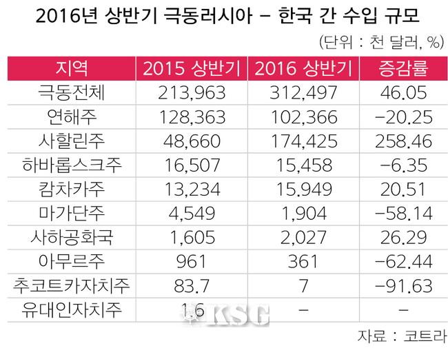 상반기 아무르주의 대한국 수출이 증가했고 한국 제품 수출은 사할린주, 하바롭스크주, 캄차카주 등을 대상으로 늘어났다. 2015년 한 해 동안 대극동러시아 수출이 60% 가까이 줄었던 것을 생각하면 올 상반기 교역규모는 긍정적이다.