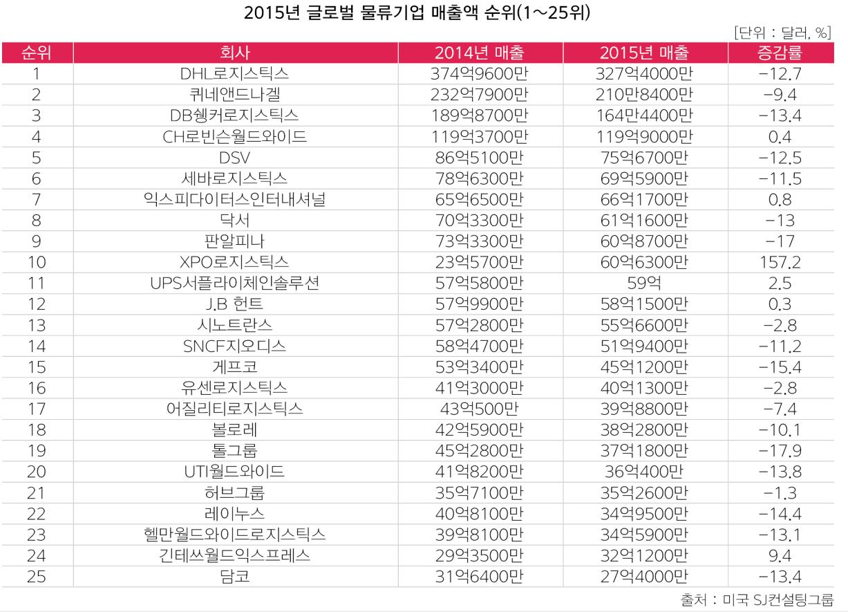 미국 SJ컨설팅그룹에 따르면 지난해 글로벌 50대 국제물류기업에서 발생한 총 매출액은 약 2300억달러(한화 약 258조8650억원)였다. 2014년 2440억달러(274조6220억원)에 비해 5.8% 감소한 수치다. SJ컨설팅그룹은 미국 달러강세로 인해 물류기업들의 매출하락 영향이 컸다고 분석했다. 이밖에 유가하락도 기업들의 채산성 악화에 결정적인 역할을 했다.