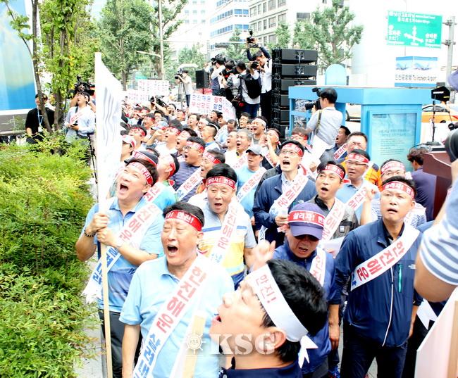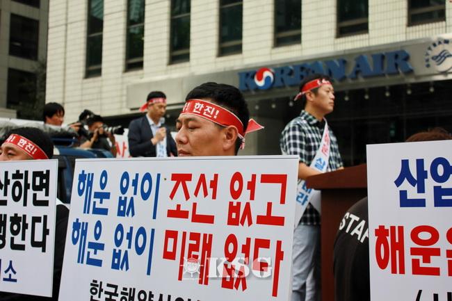 부산항만산업협회 김영득 회장은 이날 투쟁에서 “오늘 너무도 안타깝고 참담한 심정으로 이 자리에 섰다”며 “수출입화물을 가득 싣고 오대양을 누벼야 할 한진해운 선박들은 지금 미국, 중국 등 15개 외국항만에서 억류되거나 입항이 거부돼 ‘떠돌이 배’신세로 전락하고, 선원들은 생필품마저 공급이 끊겨 국제 미아가 될 처지에 놓여 있고, 우리 항만산업은 물품과 서비스를 제공하고 50억원에 이르는 대금을 받지 못함에 따라 영세업체의 줄도산과 대량 실직사태에 직면했다”고 말했다.