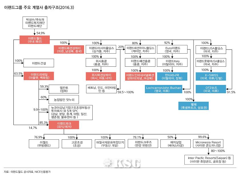이랜드그룹의 공급망은 공격적인 M&A(인수합병)를 통해 빠른 속도로 글로벌화, 다변화되고 있다. 이랜드그룹은 1980년 의류매장 ‘잉글랜드(ENGLAND)’를 모태로 형성된 계열집단이다. 패션산업을 주축으로 유통업, 휴양업, 외식업 등 적극적인 사업영역 확장을 통해 2016년 4월 공정거래위원회가 발표한 상호출자제한기업집단 자산총액기준 51위에 이름을 올렸다. 2016년 3월말 국내법인(주채무계열 소속기업체 기준) 29개사, 해외법인 108개사(중국 40개사, 미국 12개사, 이탈리아 7개사, 기타 지역 49개사)를 보유한 기업집단으로 성장했다. 특히 2010년부터 패션부문(라리오, 벨페, 피터스콧, 엘칸토, 만다리나덕, 코치넬리, 케이스위스 등), 유통부문(동아백화점, 동아마트, 광주 밀리오레, 그랜드마트 강서점 등), 레저부문(C&우방랜드, 팜스리조트, PIC 사이판, COP 리조트, 계림호텔, 대구프린스호텔, 풍림리조트, 광릉포레스트 CC 등) 등 주력 사업부문에 대한 M&A가 활발한 양상이다.