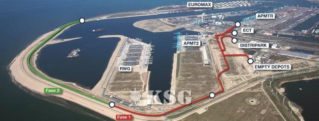 | ▲로테르담항의 마스블락트 컨테이너 터미널 환적경로로 약 29억유로(한화 약 4조원)를 투입했다. 유로맥스와 ECT는 허치슨그룹, APM터미널은 AP묄러-머스크그룹이 소유하고 있다. RWG는 CMA CGM이 30%, 현대상선 20%, MOL 20%, DP월드 30%의 지분구조로 이뤄져 있다. |