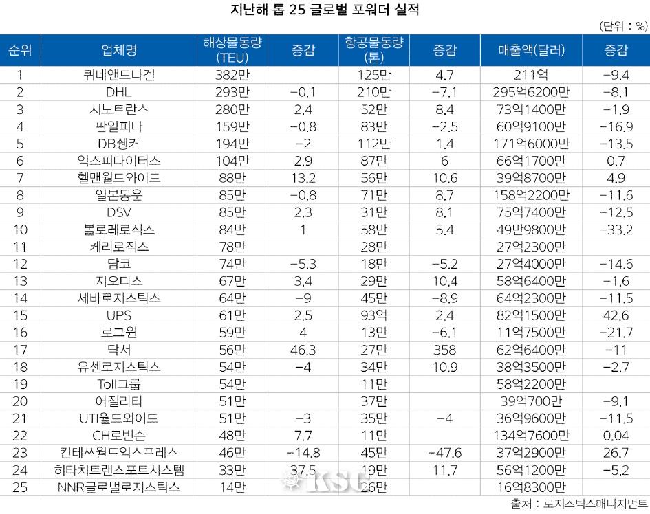 상위 10위 포워더 중에서는 미국 물류대기업 익스피다이터스와 헬맨월드와이드를 제외한 포워더의 매출액이 1년 전에 비해 꺾였다. 대부분 포워더들이 해상과 항공에서의 운송 실적이 증가했음에도 불구하고, 매출 하락으로 쉽지 않은 한해를 보냈다.