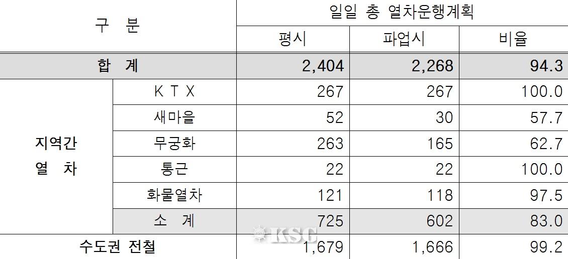 전체 열차 운행률은 평시의 94.3% 수준에 머문 것으로 나타났다. 화물열차 운행률은 97.5%를 기록했다. 화물열차 가동률이 높은 이유는 운행 계획이 평일에 비해 줄어 계획 대비 높은 실적을 보였기 때문이다.