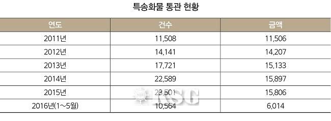 국내 직구(해외직접구매)·역직구 규모도 빠르게 성장하는 추세다. 관세청 집계에 따르면 특송화물 통관은 2011년 1150만8천건에서 2015년 2350만1천건으로 104% 증가했다. 이 기간 특송화물 불법물품 적발 건수도 48만5천건에서 131만3천건으로 크게 증가했다. 매년 국정감사에서는 특송화물 통관을 강화해달라는 주문이 꾸준히 나오고 있다.