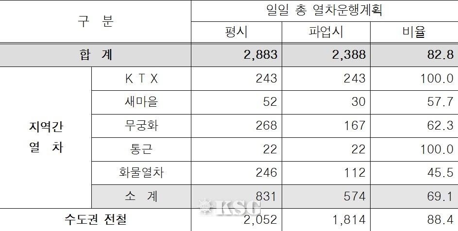 코레일에 따르면 KTX와 통근열차 가동률은 100%를 기록했다. 화물열차 가동률은 크게 떨어졌다. 화물열차 가동률은 전날 53.8%에서 19일 45.5%로 떨어졌다. 무궁화호와 새마을호는 각각 62.3% 57.7%의 운행률을 기록 중이다.
