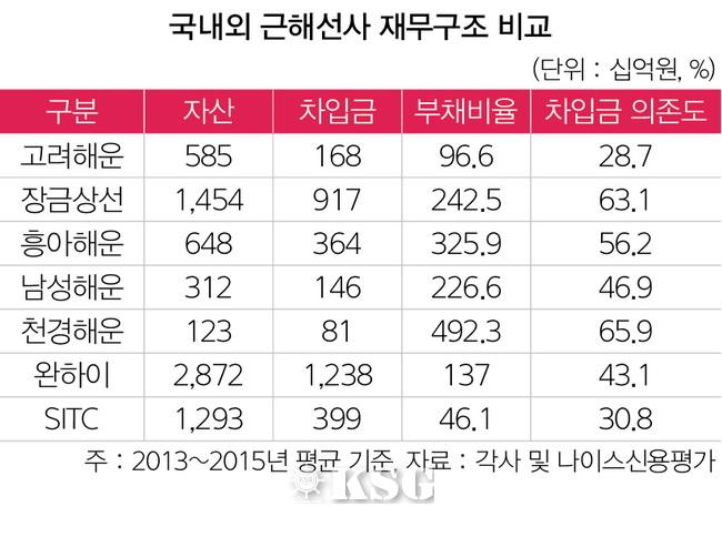 실제로 국적선사들의 재무환경은 대만이나 중국선사에 비해 열악한 것으로 파악된다. 나이스신용평가가 정리한 자료에 따르면 우리나라 근해선사들의 부채비율은 고려해운을 제외하고 모두 200~400%대에 이르는 반면 중국 SITC는 46.1% 대만 완하이는 137%에 불과한 것으로 조사됐다.